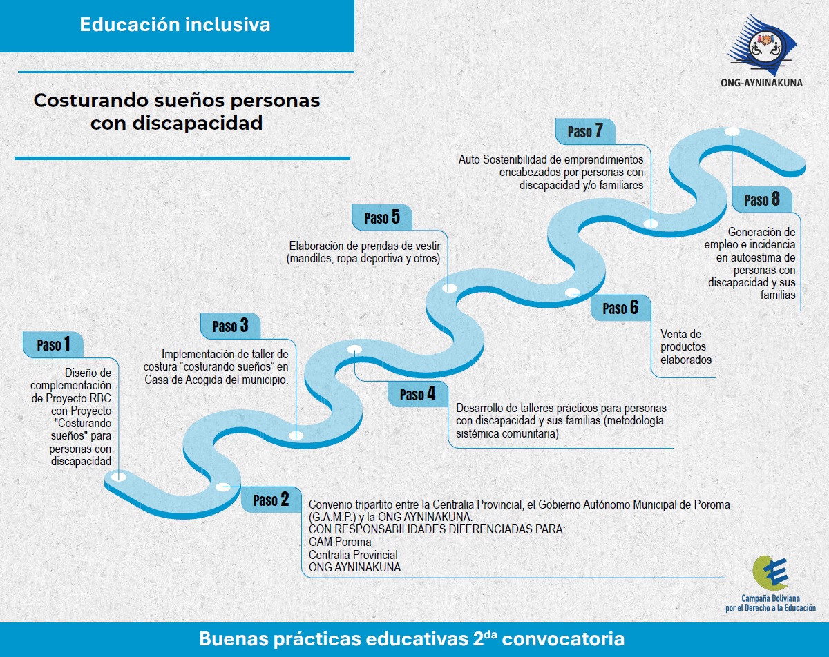 Las buenas prácticas en formación técnica en costura del proyecto complementario «Costurando Sueños» forman parte del proyecto macro de Rehabilitación Basada en la Comunidad (RBC) Poroma, implementado por la institución AYNINAKUNA en el municipio de Poroma. Este proyecto apoya a personas con discapacidad y sus familias para el ejercicio pleno de sus derechos en áreas como educación, salud, empoderamiento y sustento.
