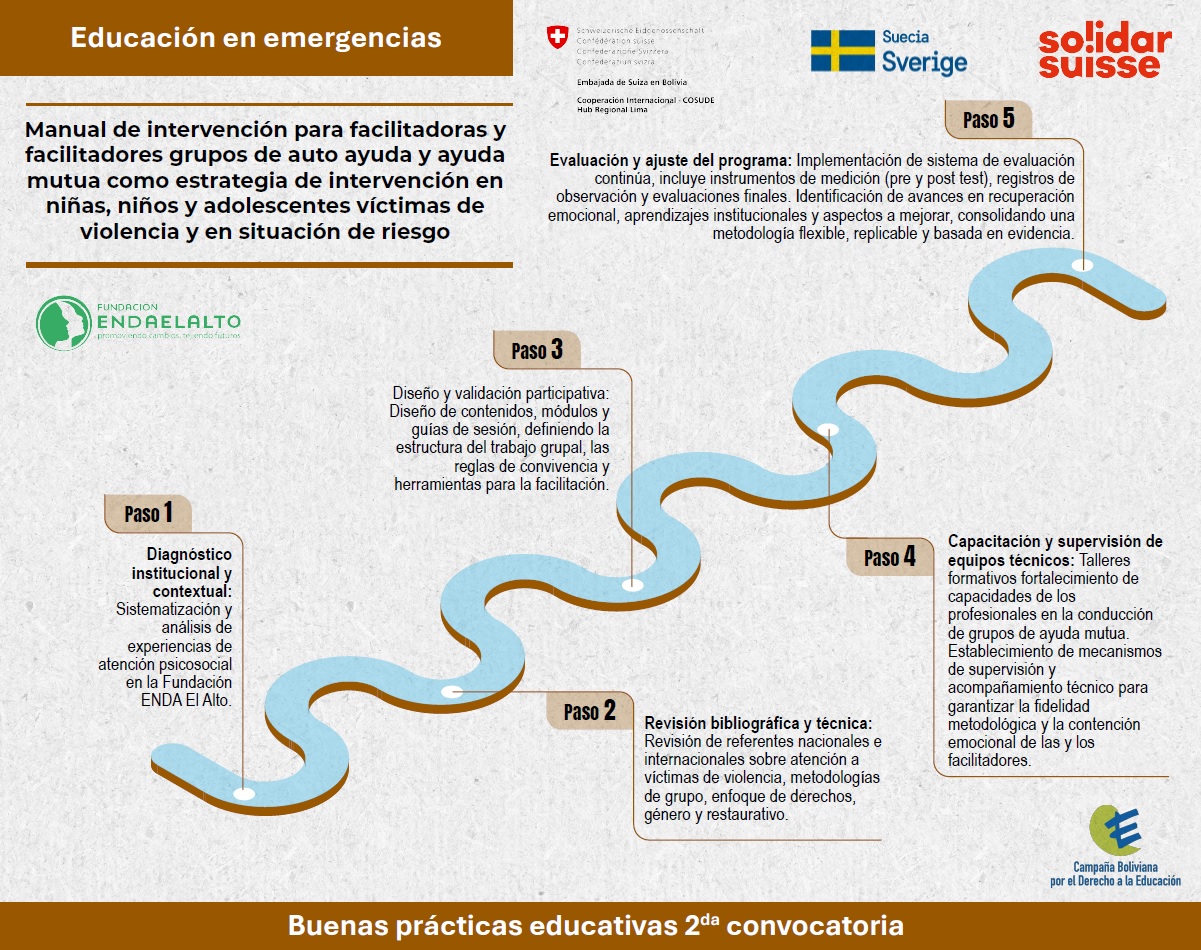 El Programa es una herramienta técnico– pedagógica elaborada por la Fundación ENDA El Alto a partir de la experiencia del proyecto “Atención Integral de niñas y adolescentes víctimas de violencia en la ciudad de El Alto” (2017–2020), con el apoyo de Cáritas Suiza. Surge como respuesta a la necesidad de fortalecer las capacidades de los equipos que trabajan con niñas, niños y adolescentes víctimas de violencia física, psicológica y sexual, así como con sus familias, promoviendo procesos de atención integral con enfoque de derechos, género, restaurativo y psicosocioeducativo.