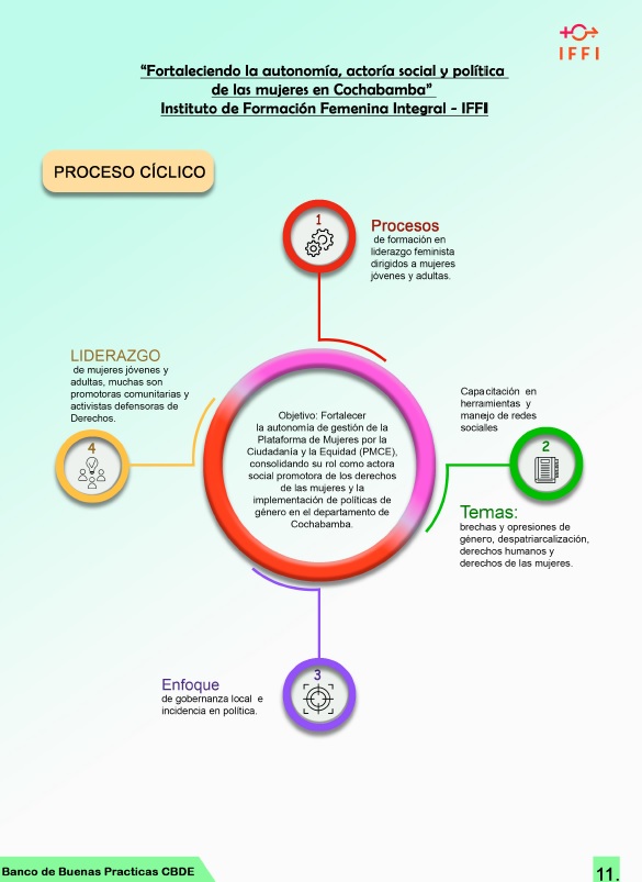 Proyecto: “Fortaleciendo la autonomía, actoría social y política de las mujeres en Cochabamba”, cuyo objetivo fue fortalecer la autonomía de gestión de la Plataforma de Mujeres por la Ciudadanía y la Equidad (PMCE), consolidando su rol como actora social promotora de los derechos de las mujeres y la implementación de políticas de género en el departamento de Cochabamba.