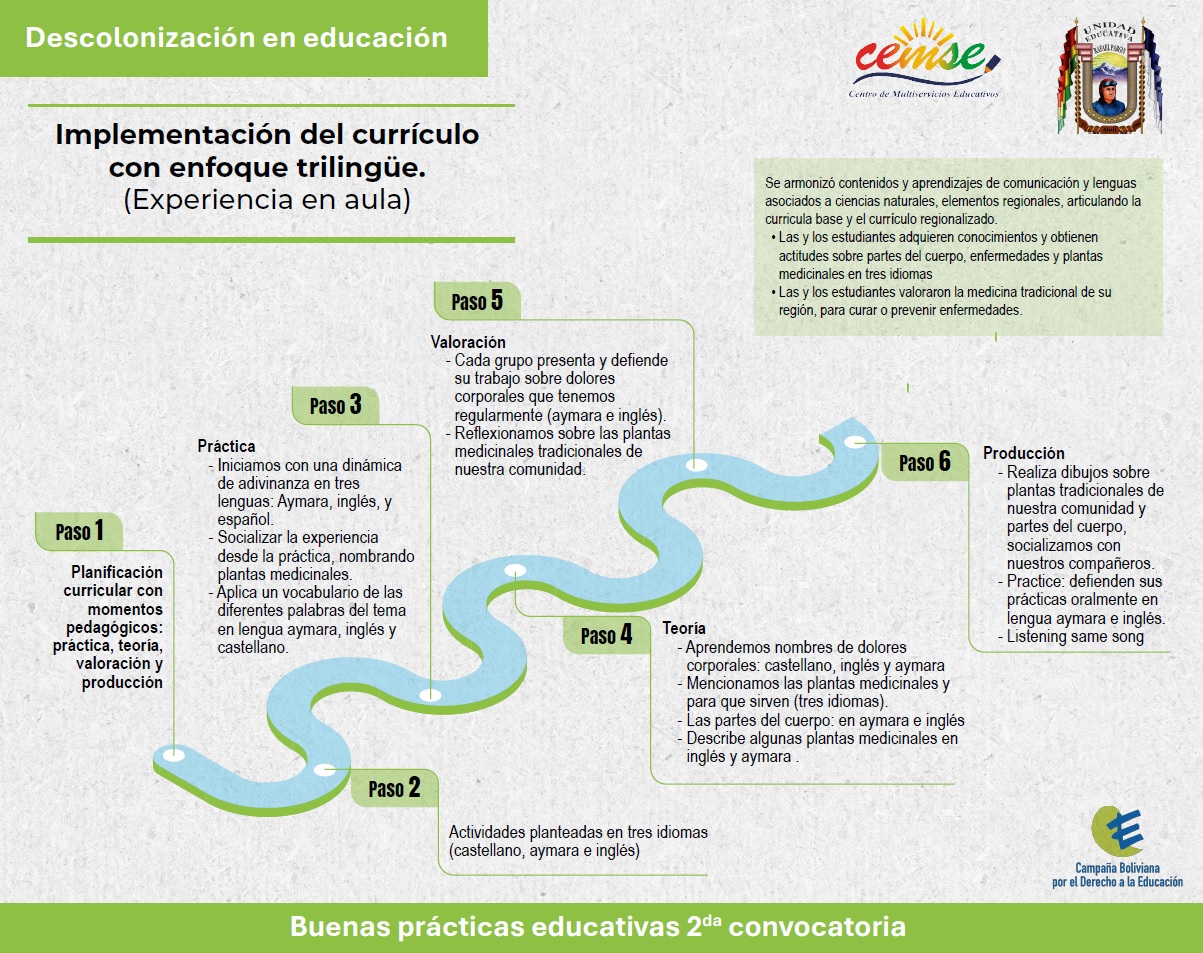 “Promoviendo el derecho de niñas, niños y adolescentes de pueblos indígenas originario-campesinos a educarse en su propia lengua, cultura y con igualdad de género en un contexto de recuperación justa post-pandemia Covid-19 en 6 regiones de Bolivia” – Implementación del currículo con enfoque trilingue. Educación Primaria – Plan Social Productivo “NUESTRA COMUNIDAD EDUCATIVA LIMPIA Y SANA, UNIDA CONTRA TODA FORMA DE VIOLENCIA” – APRENDIZAJES EN TRES IDIOMAS (CASTELLANO, AYMARA E INGLÉS). U.E. Rafael Pabón – 4to año de escolaridad Secundaria, El Alto.
