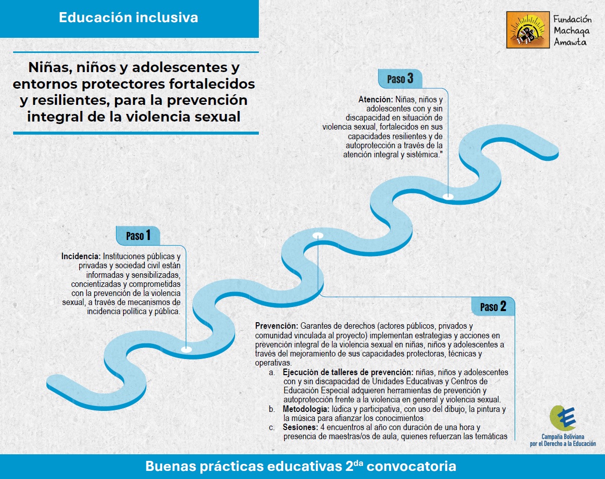 En este marco la FMA implementó el proyecto «Niñas, niños y adolescentes y entornos protectores fortalecido y resilientes, para la prevención integral de la violencia sexual», el fin del proyecto es el de constribuir al desarrollo pacífico y sostenible en Bolivia, a traves del establecimiento de espacios insclusivos, seguros y saludables para niñas, niños y adolescentes con y sin discapacidad.