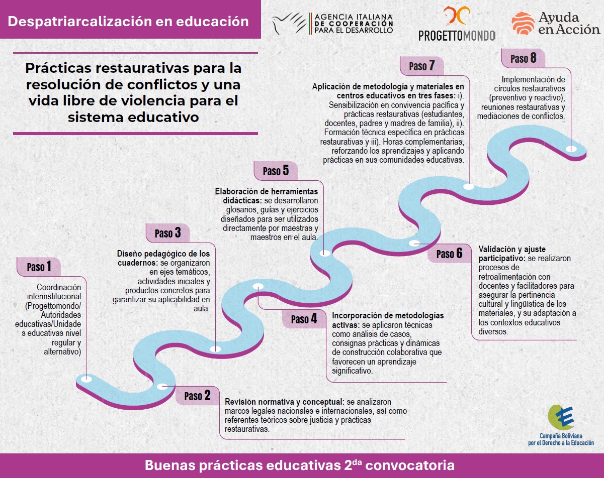 Se elaboró el ciclo formativo en “Prácticas restaurativas para la resolución de conflictos y una vida libre de violencia para el Sistema Educativo”. Está dirigido a docentes de educación regular en los niveles inicial, primario y secundario y educación alternativa. Se acompaña asistencia técnica para la implementación de estas prácticas en las unidades educativas. Su objetivo es fortalecer la capacidad de las y los educadores para gestionar los conflictos escolares desde un enfoque restaurativo, promoviendo la resolución pacífica de conflictos, una cultura de paz y la construcción de comunidades educativas inclusivas. Las prácticas restaurativas contribuyen a eliminar patrones de violencia, discriminación y desigualdad que afectan las relaciones escolares, generando espacios seguros de diálogo donde se favorece la equidad de género y el respeto a la diversidad.