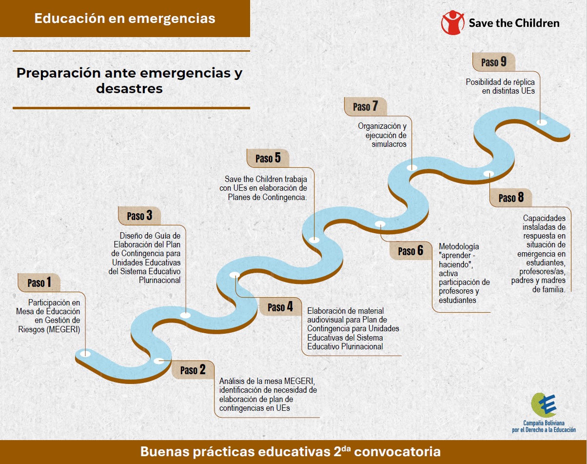 Para alcanzar estos objetivos se capacitó a docentes, estudiantes, juntas escolares y personal administrativo en la Ley N° 602 de Gestión de Riesgos y su normativa complementaria, en las Normas Mínimas de Educación en Situaciones de Emergencia (INEE), en la Guía para la Elaboración de Planes de Contingencia en Unidades Educativas del Ministerio de Educación del Estado Plurinacional de Bolivia, así como en los conceptos y procedimientos de simulación y simulacro de evacuación ante emergencias o desastres, incluyendo inundaciones, incendios, sismos, granizadas, tormentas eléctricas, vientos huracanados y otros eventos.