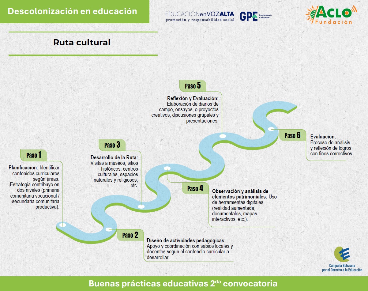La experiencia que se presenta se denominada Ruta Cultural: Es un estrategia que ayuda al maestro del nivel secundario a cumplir de mejor manera los contenidos curriculares de las áreas de Ciencias Sociales, Valores y Espiritualidad; Música; Lenguaje y Literatura; Ciencias Naturales, entre otros.
